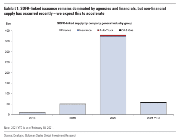 U.S. housing finance giants Fannie Mae FNMA, +1.08%, Freddie Mac FMCC, +0.28%, as well as JPMorgan Chase & Co JPM, +1.67%, have been top issuers to rely on the new benchmark. The Goldman chart below tracks the increase in SOFR-linked debt issuance in the past few years, with the finance sector leading the way.